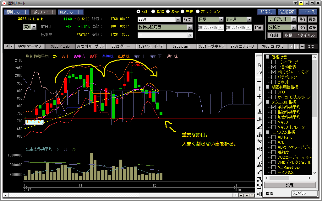 KLabは雲下抜けに加え、地合いの悪化もあり本日も続落。
