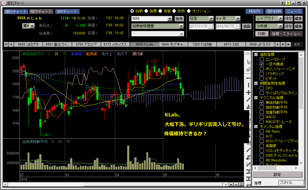 KLabも75日線、ボリンジャーバンド-1σを下走り一目均衡表の雲上限にタッチしてしまいました。