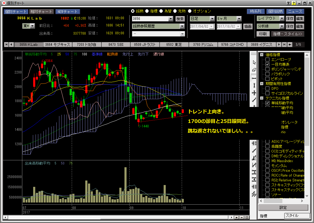 節目の1700と日足25日が近づいてきていますが、サイバーステップやトーセといったセクター牽引銘柄が頑張っているうちにこの節目を超えていってほしいと思っています。